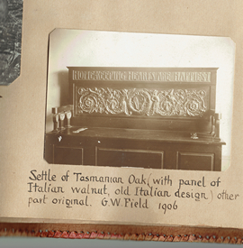 Settle carved 1906 for George. W. Field. DB133 Nellie carved this settle for one of her brothers, George Westfield Field (1862-1935) who married Ethel Archer. They had 8 children. Atkinson says “The design on the back of this settle was unusually elaborate and graceful, and the legend it bore was ‘Home Keeping Hearts are Happiest’”