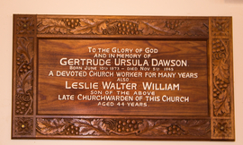 Memorial plaque Gertrude Ursula Dawson, St Andrew’s Church, Westbury. Carved 1945.