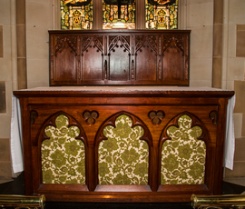 Altar, reredos, and hymn board, St Mary’s Church, Gretna. Carved 1948.