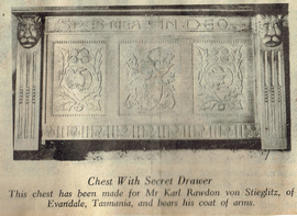 Chest for Karl von Stieglitz. Carved circa 1949. DB117 “Courtesy of Queen Victoria Museum and Art Gallery, Launceston” Karl Rawdon von Stieglitz was born on 19 August 1893 at “Andora”, Evandale, the son of John Charles and Lillian Brooke Vere (née Stead) von Stieglitz. After his father’s death in 1916, he took possession of “Andora”. […]