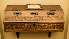 Memorial alms box commemorating Willis James Parker, Launceston Church Grammar School. Carved 1949. DB136 A carved wooden Alms box commemorates Willis James Parker who was killed in action at Tsimba Ridge on Bougainville in February 1945 during World War Two. It is located at Launceston Church Grammar School, Tasmania.